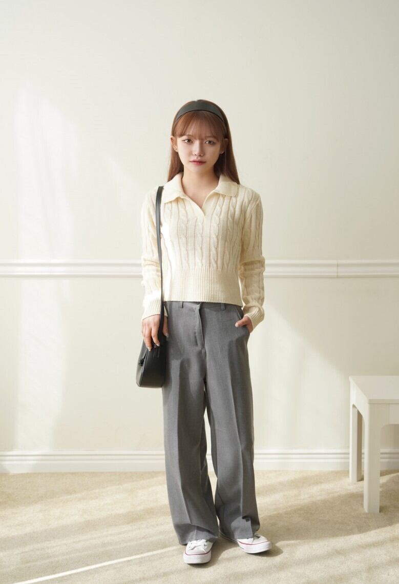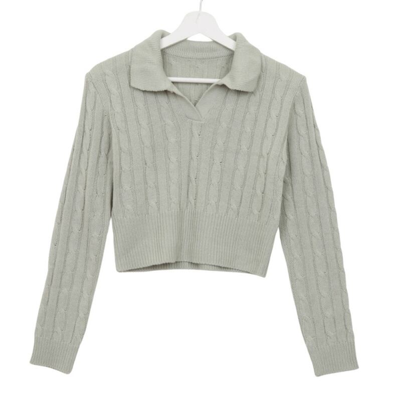 トレンドのクロップド丈のケーブルニットのトップスです。Vネックに襟付きで、上品で可愛らしい印象を与えるデザインです。ケーブルニットの程よいざっくり感が出て、他のトップスとは一味違った雰囲気を醸し出します。