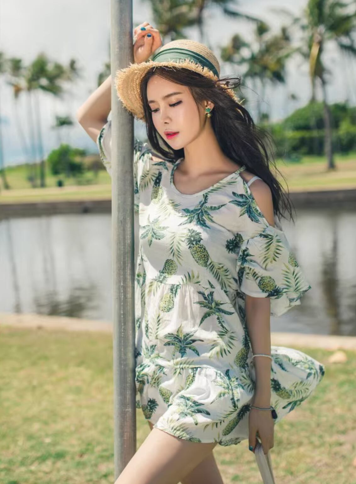 爽やかなカジュアルスタイルを叶えるパイン柄のワンピース。肩見せのデザインが涼やかで、海やプールでの華やかなスタイリングに最適です。夏のリゾートにぴったりの一枚。