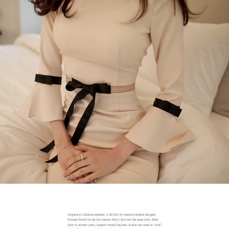 ウェストラインとスリーブ部分に配色のさりげないリボンデザインが上品でたおやかな女性を演出してくれるワンピース。スリムなシルエットがメリハリあるボディラインを作り出し、女性らしい美しさを印象付けてくれます。