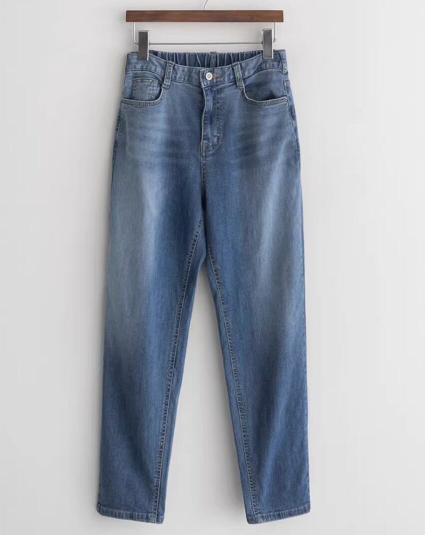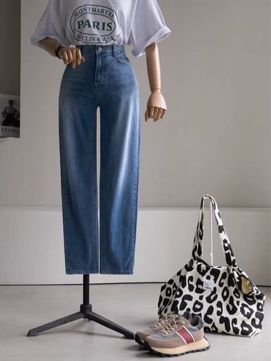 ハイウエストのデニムパンツで、ストレートシルエットでラフな雰囲気もあるのでカジュアルなスタイリングにもピッタリ。ウエストゴムなので楽ちんで着心地抜群。ダークトーンの無地なのでどんなトップスにも合わせやすく、着回し力も抜群です。
