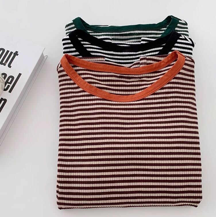 トップス リブ ボーダー 細ボーダー Tシャツ カットソー プルオーバー 半袖 パイピング ラウンドネック 伸縮性 シンプル カジュアル レトロ こなれ感 ラフ やわらかい 着心地 部屋着 ルームウェア 万能 ベーシック 春 夏 秋 レディース ママ OL 通勤 学生 通学 大人 デイリー お出かけ 公園 ショッピング おうち時間 着回し 普段使い 重ね着 楽ちん 定番 リラックス 毎日 快適 ストレスフリー S M L XL ゆったり 黒 ブラック 緑 グリーン 茶色 ブラウン 渋めカラー 秋カラー