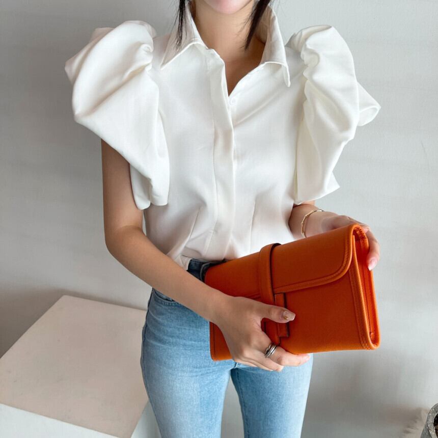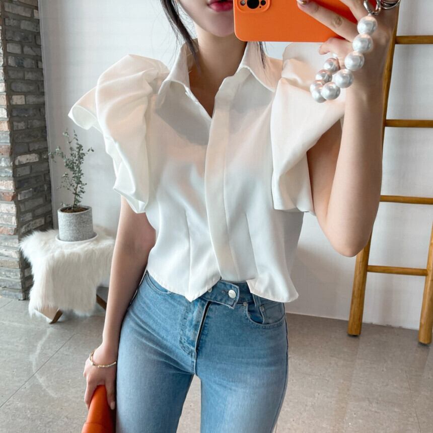 トップス シャツ ブラウス カットソー プルオーバー ショート ショート丈 袖あり 半袖 パフスリーブ Vネック 襟付き スリム タイト 細身 前開き 薄手 かわいい 大人可愛い きれいめ カジュアル 大人 上品 おしゃれ 大人女子 ラブリー キュート ガーリー 個性的 モード系 存在感 無地 春 夏 レディース オフィス ビジネス OL 通勤 学生 通学 デート お出かけ 女子会 休日 パーティー リゾート 旅行 ホテル レストラン 着回し 普段使い 楽ちん モテ 体系カバー S M L 白 ホワイト