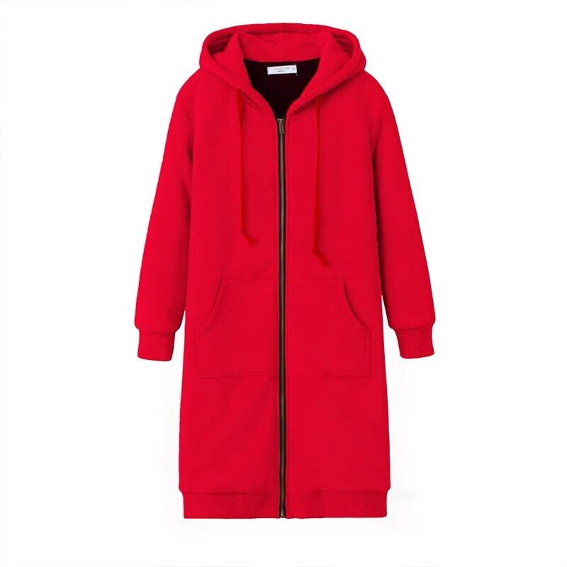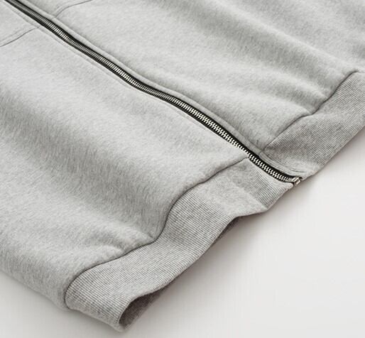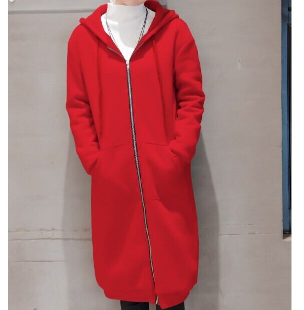 裏起毛で温かい、ロング丈のジップアップパーカー。