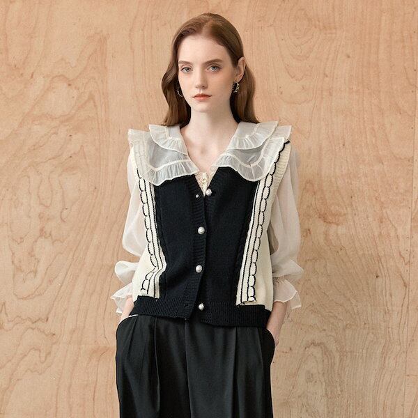 鮮やかなスカラップラインとパールボタンがまぶしい、華やかなニットベストです。