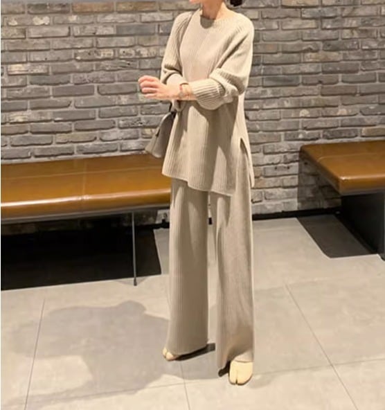 ニットソーは厚手で暖かく、ワイドパンツはゆったりとしたシルエットでリラックスして着ることができます!