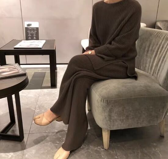 セットアップ ルームウェア パジャマ ニットソー セーター プルオーバー トレーナー ジャージ 部屋着 寝巻き ナイトウェア ワイドパンツ ストレートパンツ ガウチョパンツ ロング ロング丈 袖あり 長袖 ラウンドネック ワイド サイドスリット ニット 厚手 かわいい シンプル ラフ ルーズ 抜け感 無地 オールシーズン レディース 休日 ヨガ 着回し 普段使い 楽ちん 体系カバー S M L XL 2XL ゆったり ゆる 黒 ブラック 青 ブルー 茶色 ブラウン ベージュ アプリコット