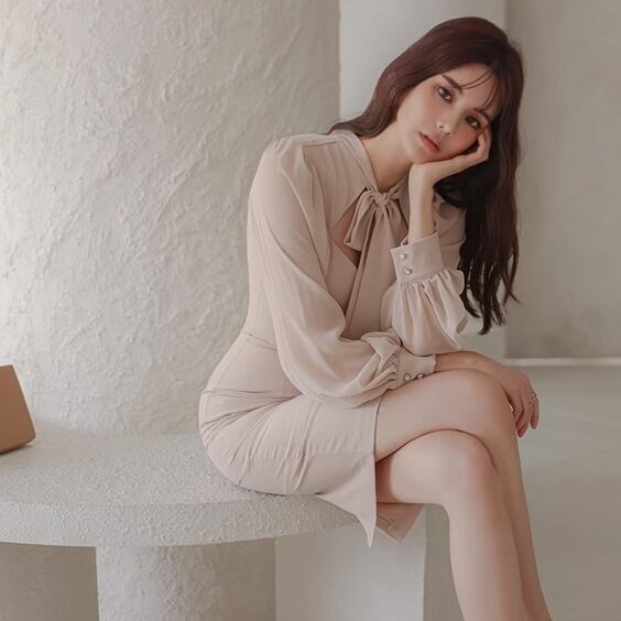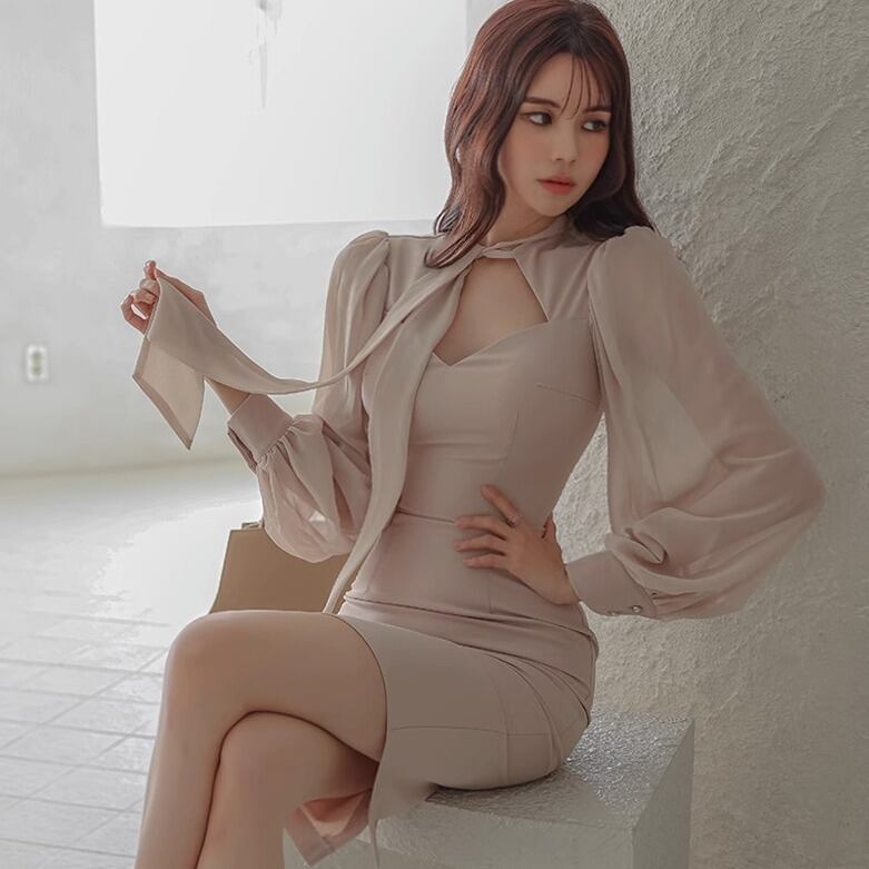 ワンピース 膝丈 ひざ丈 膝上 袖あり ボリューム袖 パフスリーブ りぼんタイ スリム タイト 細身 Iライン シフォン リボン スリット 透け感 シースルー コンサバ シアー 異素材MIX きれいめ シンプル カジュアル 上品 おしゃれ レトロ こなれ感 キュート セクシー フォーマル 都会的 ラグジュアリー ハイエンド ドレッシー 清楚 無地 春 秋 20代 30代 レディース 女性用 オフィス ビジネス OL 通勤 パーティー ホテル レストラン 婚活 合コン 普段使い 韓国系 モテ ベージュ