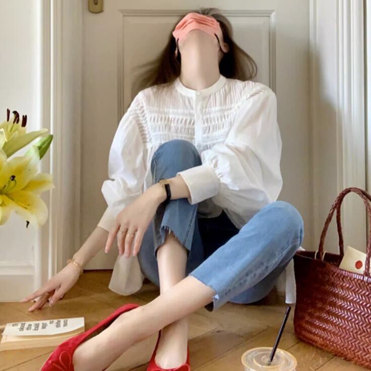 シャツ ブラウス プルオーバー 袖あり 長袖 ボリューム袖 パフスリーブ ラウンドネック 襟なし ノーカラー フレア ワイド 前開き 透け感 コンサバ ギャザー 薄手 かわいい きれいめ シンプル カジュアル おしゃれ レトロ こなれ感 ラフ ガーリー 抜け感 休日感 ラグジュアリー 清楚 無地 春 夏 10代 20代 30代 40代 50代 60代 レディース 女性用 オフィス ビジネス OL 通勤 お出かけ 休日 ショッピング 着回し 普段使い 重ね着 楽ちん モテ 体型カバー ホワイト ブルー