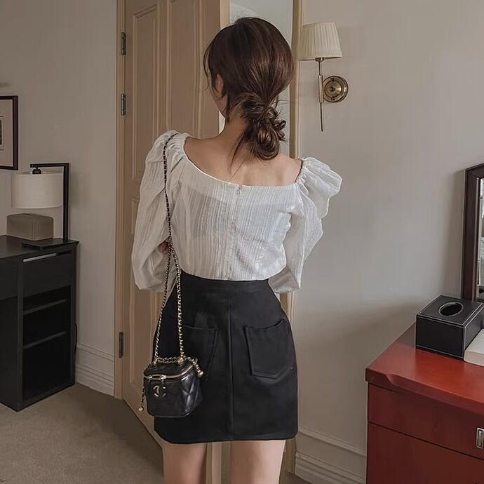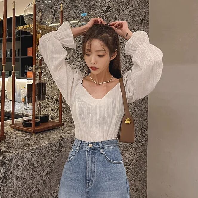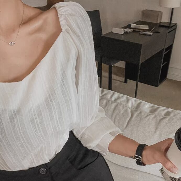 トップス プルオーバー 袖あり 長袖 ボリューム袖 パフスリーブ Vネック 襟なし ノーカラー シフォン 透け感 薄手 艶感 光沢 大人可愛い きれいめ シンプル カジュアル 上品 おしゃれ レトロ こなれ感 ラフ キュート エレガント 存在感 都会的 ラグジュアリー ハイエンド ドレッシー 清楚 無地 春 夏 秋 20代 30代 40代 レディース 女性用 オフィス ビジネス OL 通勤 デート お出かけ 休日 パーティー ホテル レストラン Bar 婚活 合コン 普段使い 韓国系 楽ちん ホワイト