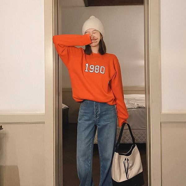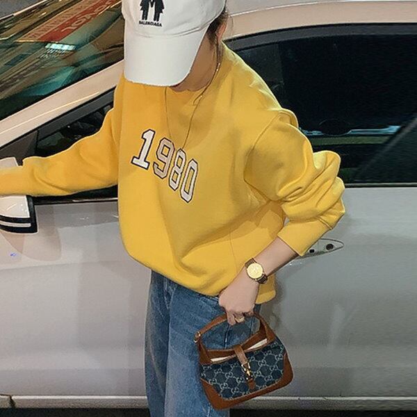 トップス プルオーバー トレーナー スウェット 袖あり 長袖 ドロップショルダー 萌袖 クルーネック かわいい カジュアル おしゃれ お洒落 かっこいい ラフ メンズライク マニッシュ ボーイッシュ スポーティー ガーリー ルーズ クール プリント 春 秋 冬 学生 通学 デート お出かけ 女子会 お泊まり 休日 アウトドア 着回し 普段使い お揃い 韓国 韓国系 楽ちん インスタ映え S M L XL ゆったり ゆる イエロー オレンジ ネイビー