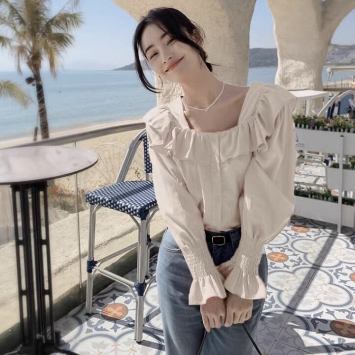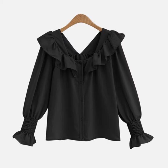 首元の大胆なフリルデザインがガーリーな印象を演出してくれるシンプルなノーカラーシャツ。前後どちらでも着こなしが可能。その日に合わせてお好きな方を選べます◎ 大人可愛い上品さとこなれ感を纏うふんわりしたスリーブは、とびきり女性らしい魅力を引き出してくれます。