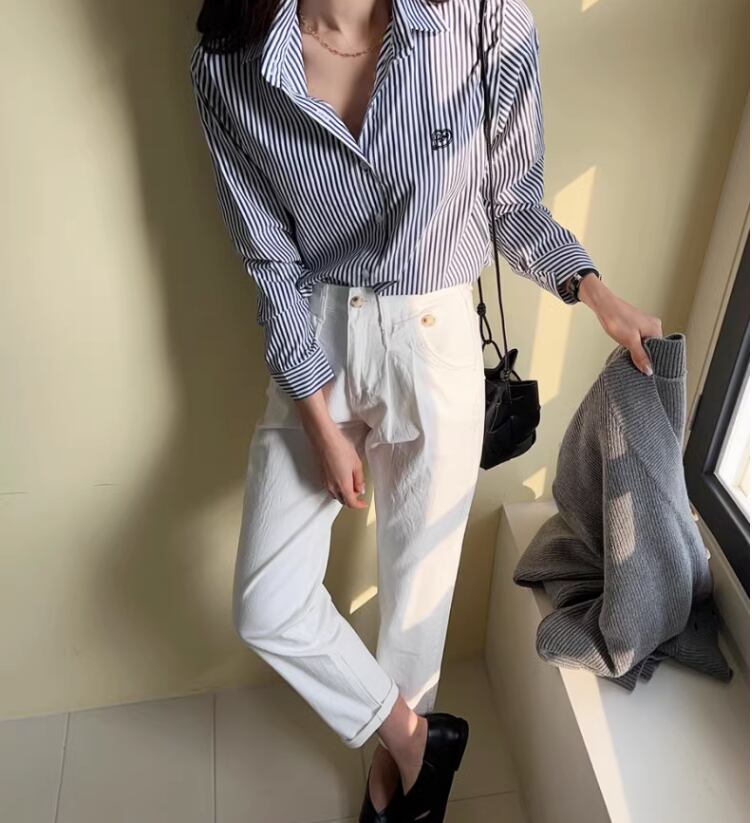 上質なストライプ柄がエレガントな大人可愛いシャツが登場しました。オフィスカジュアルからカジュアルスタイルまで幅広くマッチする、ストライプ柄シャツです。Vネックと襟付きを採用しているため、きちんと感があり、オフィスにもOK。