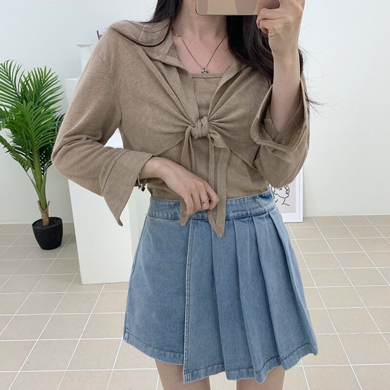 レディース カーディガン キャミソール アンサンブル ショート 長袖 萌袖 襟付き りぼんタイ 細身 リボン 前開き 透け感 伸縮性 薄手 大人可愛い きれいめ カジュアル 上品 おしゃれ ラフ ガーリー ルーズ 抜け感 学生風 無地 オールシーズン オフィス ビジネス OL 通勤 学生 学校 通学 デート お出かけ アウトドア イベント レストラン ガーデン ショッピング コンサート ライブ 合コン カフェ 婚活 重ね着 普段使い 着回し 定番 M フリーサイズ ベージュ ネイビー