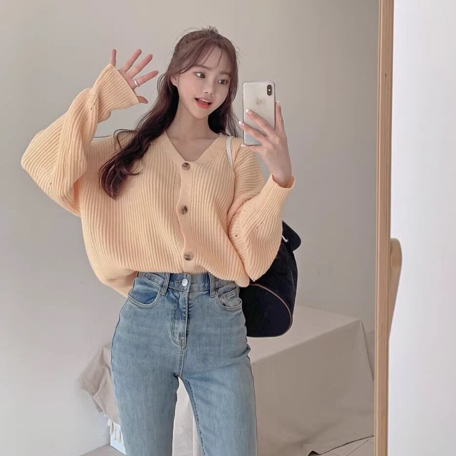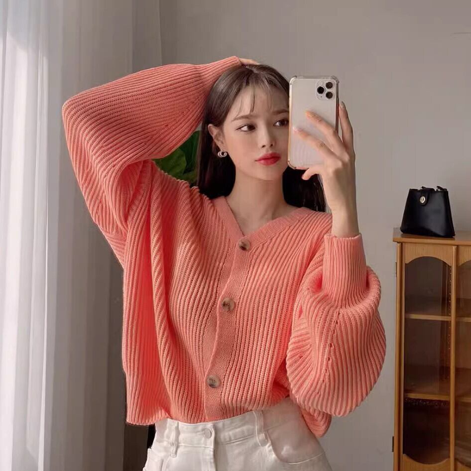 ざっくりしたシルエットとボリューム袖が可愛いVネックカーディガンです。