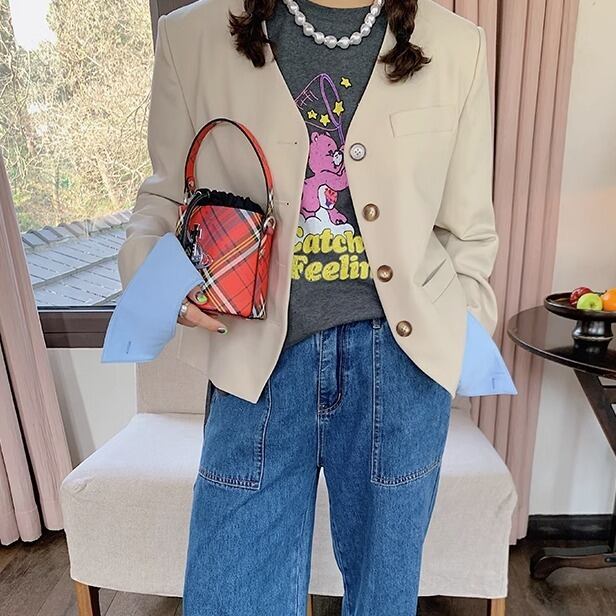 ノーカラーの上品なカラーリングのジャケットは、お顔周りの窮屈感もなく、カジュアルな着こなしにも最適な1枚。スーツライクなデザインだから、ビジネスシーンにもマッチします。カジュアルなスタイリングから上品なコーディネートまで幅広く対応。年齢も問わないデザインだから長く愛用して頂けますよ◎レイヤードスタイルにも適した、ゆったりめのサイズ感が嬉しい!