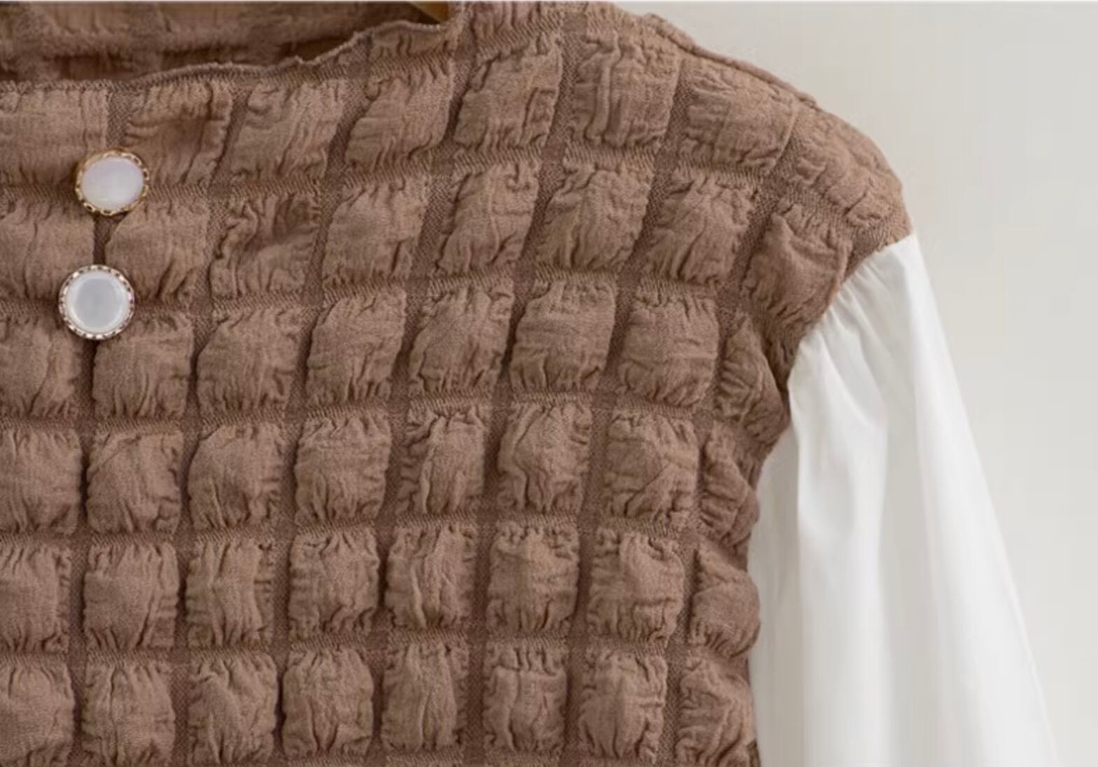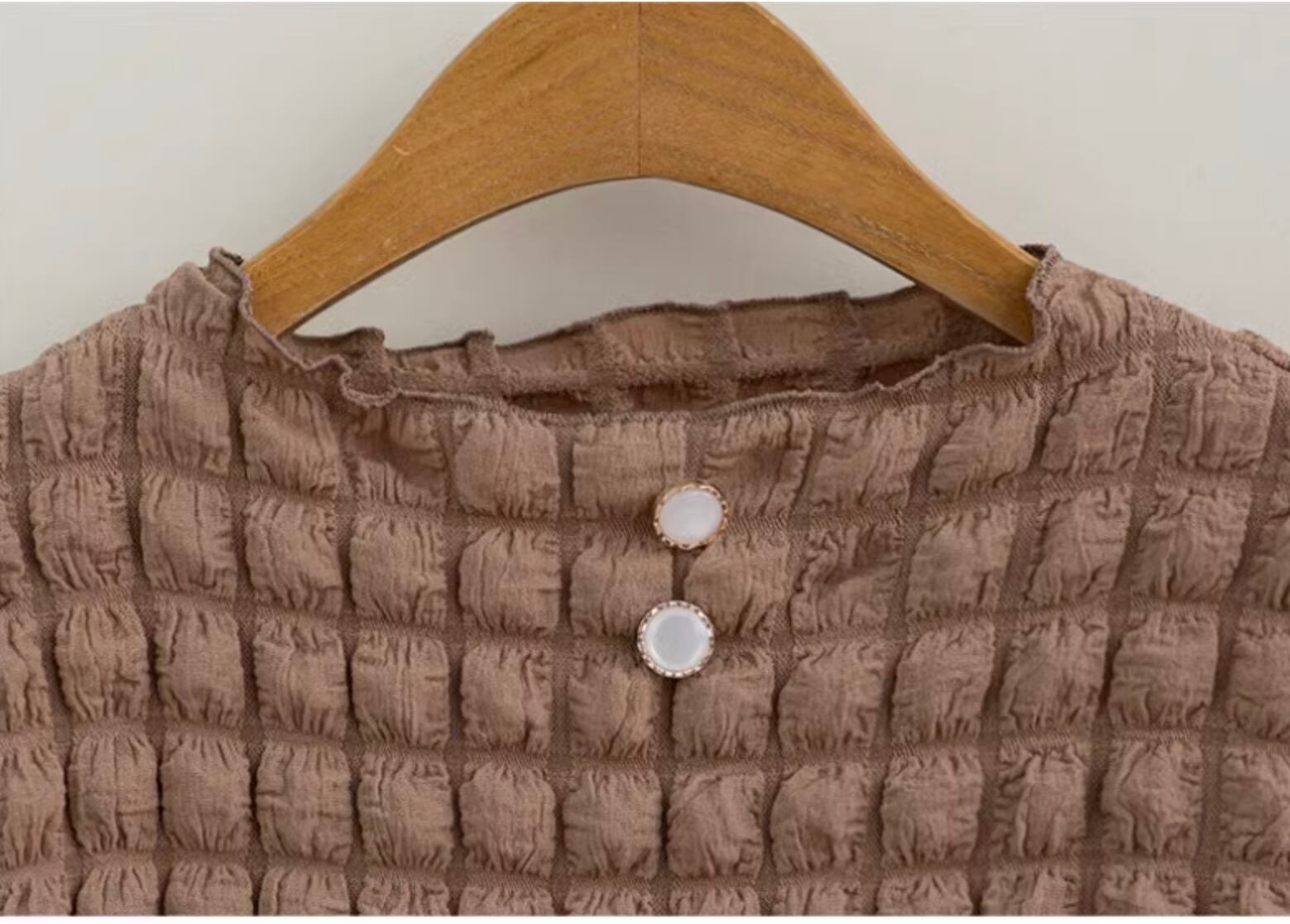 トレンド感満載のポコポコしたポップコーン生地が大人可愛いトップス。