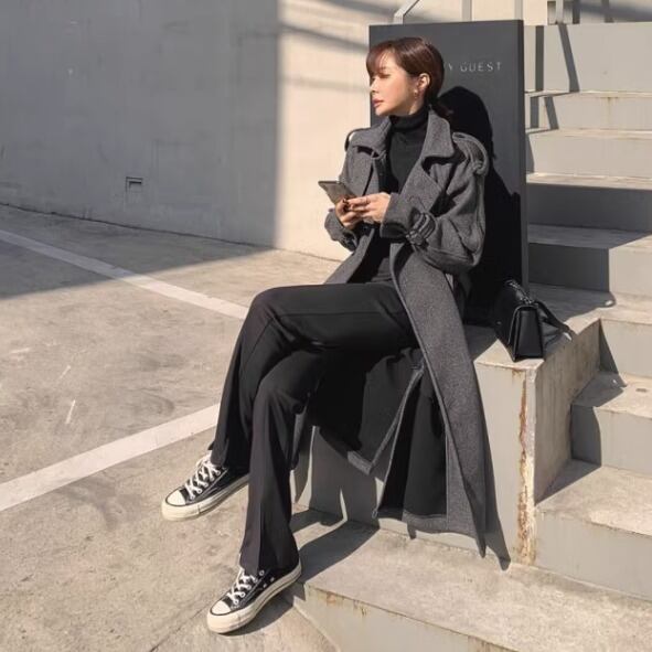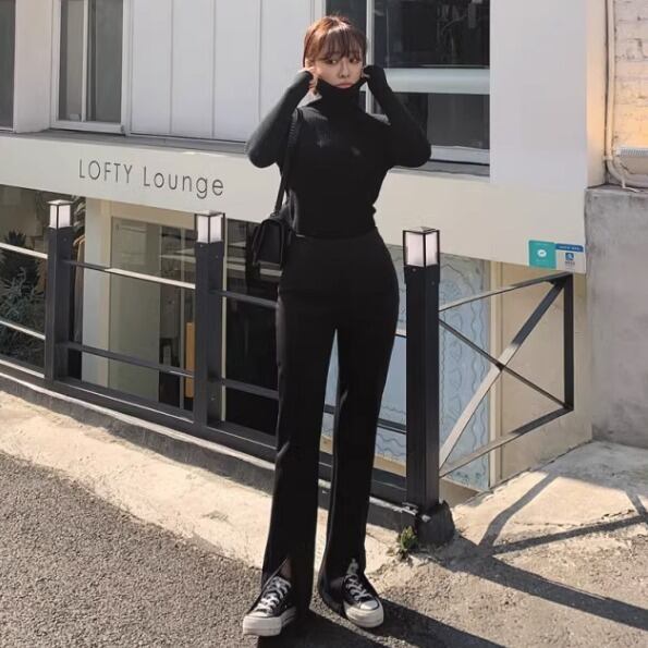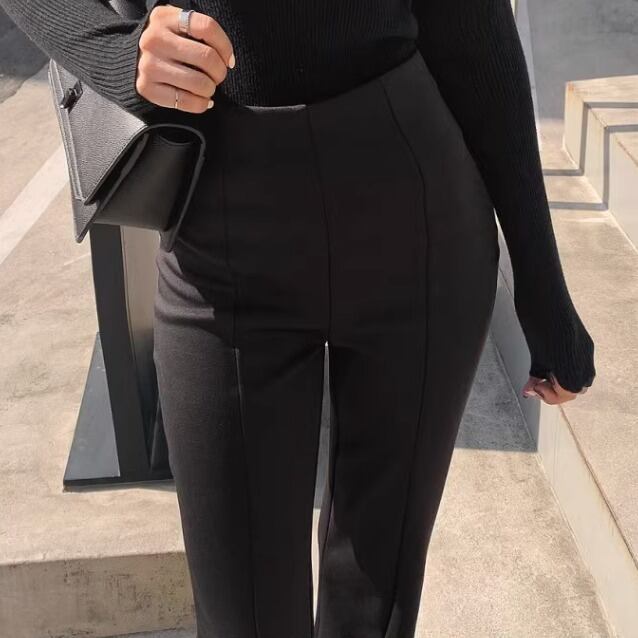裾のスリットデザインで、ブーツカットのようなシルエットのロングパンツは、上品でスタイリッシュな雰囲気を持ちスリムなラインが美しい脚長効果を演出します。ウェスト周りはサイドジップを起用することで、お腹周りもすっきり見え、モタたつきもありません。コンサバな雰囲気からカジュアルまで幅広いスタイルに対応。トレンド感ある着こなしをお楽しみください。