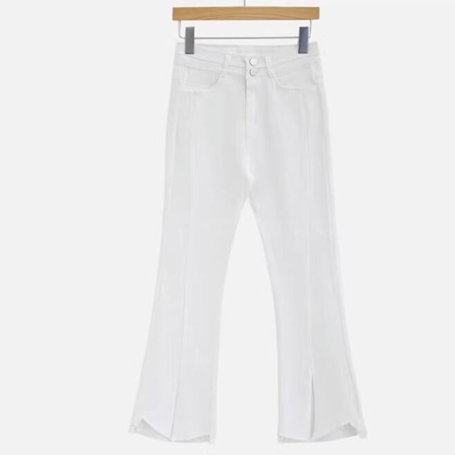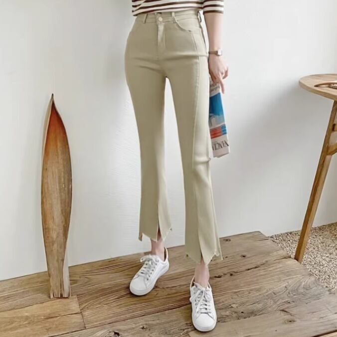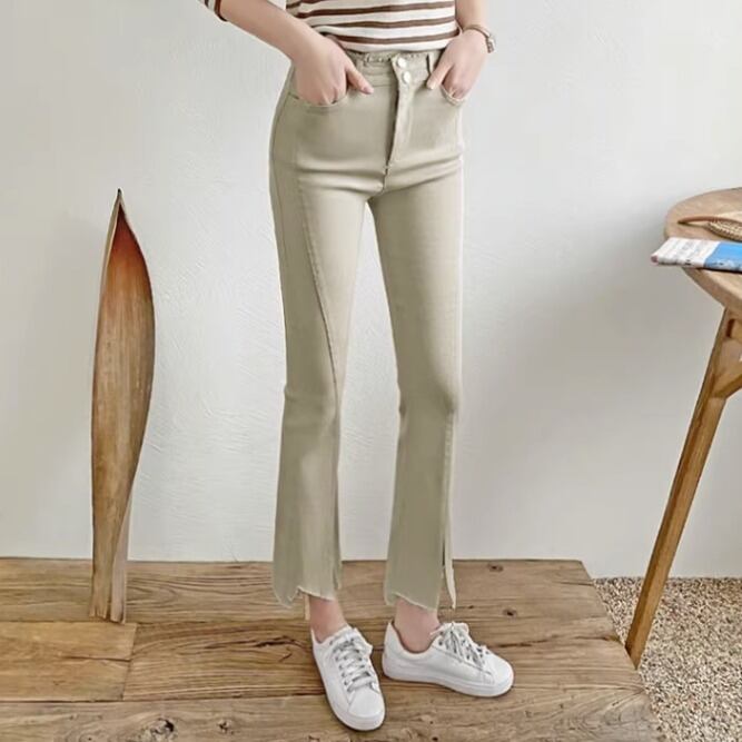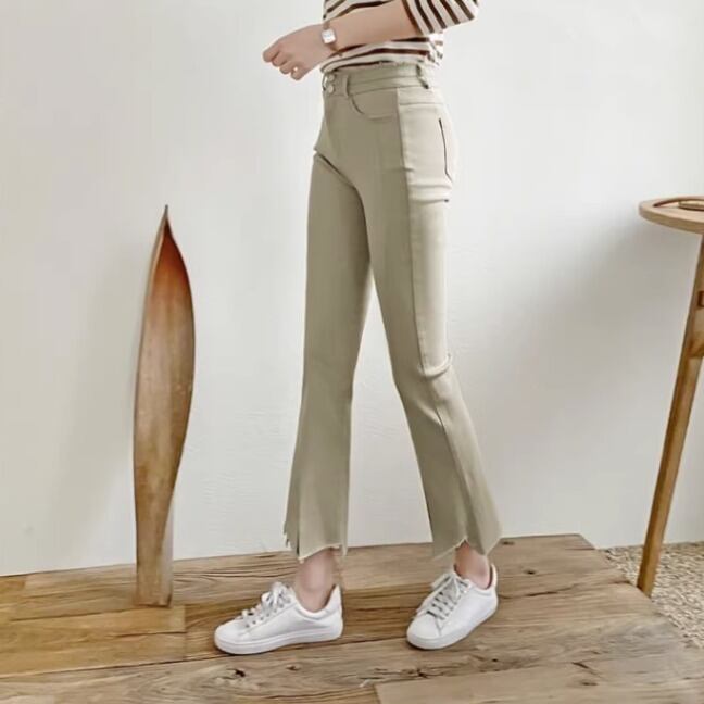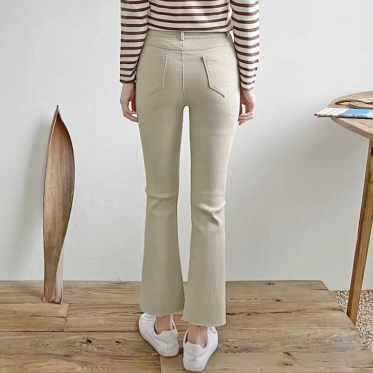 パンツ ボトムス ロングパンツ ロング 9分丈 スリム 裾ワイド ブーツカット 立体裁断 スリット ファスナー ポケット 前開き 切りっぱなし ストレッチ 伸縮性 きれいめ シンプル カジュアル おしゃれ レトロ こなれ感 ラフ 個性的 存在感 アメリカン アクティブ ナチュラル 休日感 無地 春 秋 お出かけ イベント 旅行 休日 ショッピング 合コン 楽ちん 体型カバー 美脚 普段使い 着回し トレンド 定番 S M L XL ゆとり感 クリーム ブラック ベージュ ベーシックカラー 大人カラー
