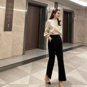 パンツ ボトムス ロングパンツ スラックス クロップドパンツ ロング 9分丈 クロップド丈 ワイド ストレート センタープレス ポケット きれいめ シンプル 上品 おしゃれ かっこいい レトロ こなれ感 メンズライク マニッシュ エレガント フォーマル 抜け感 かっちり 都会的 ラグジュアリー クラシカル ベーシック ハイエンド ドレッシー 無地 春 秋 オフィス ビジネス OL 通勤 パーティー レストラン ホテル 韓国 普段使い 着回し 清楚 トレンド XS S M ゆとり感 ブラック ベージュ