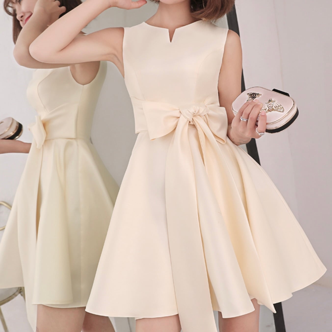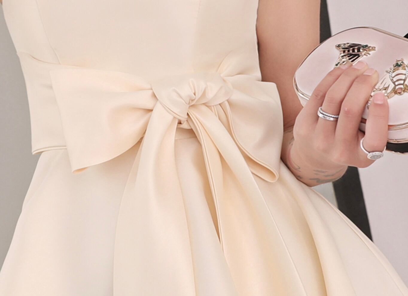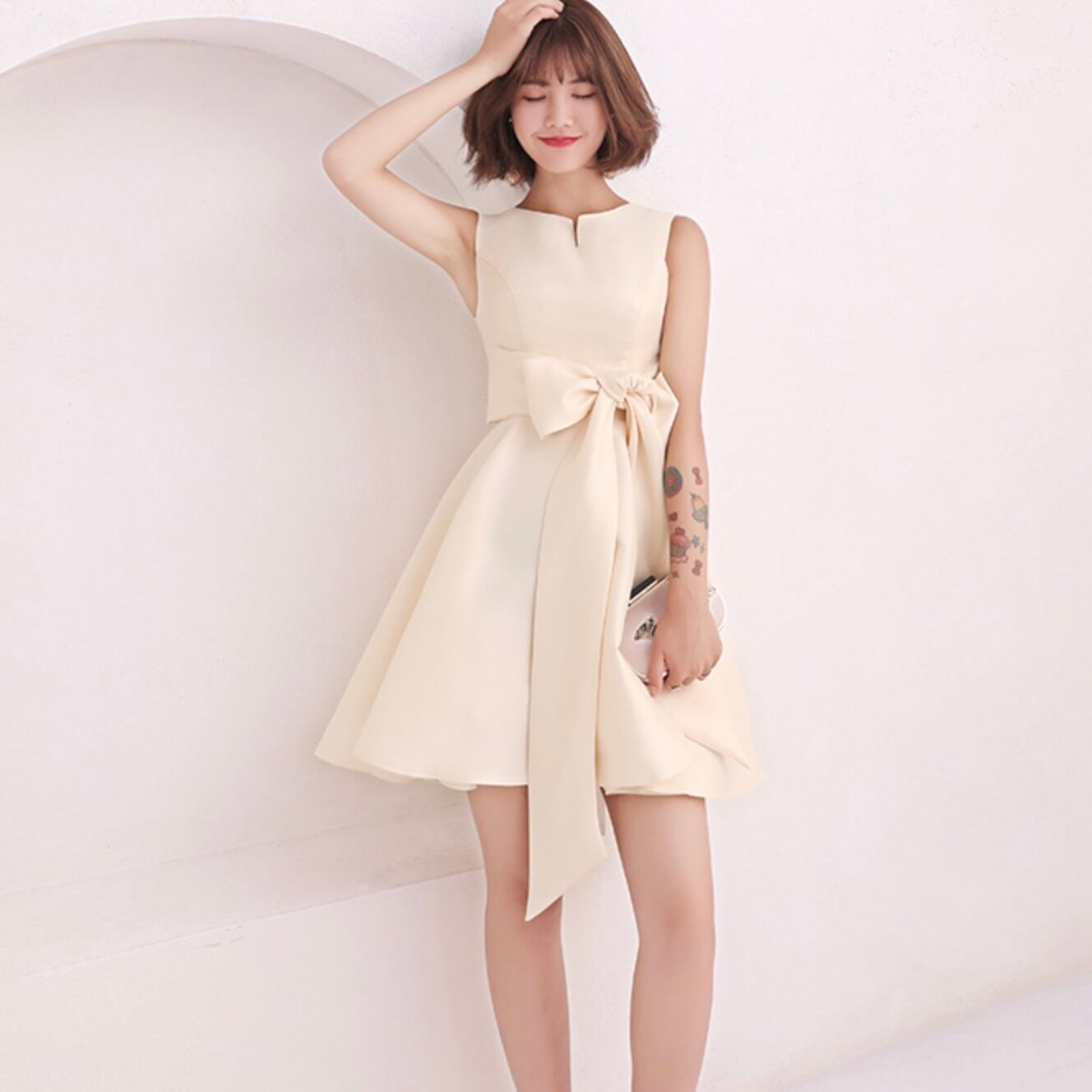 大きめリボンが大人可愛い印象のワンピースドレス。