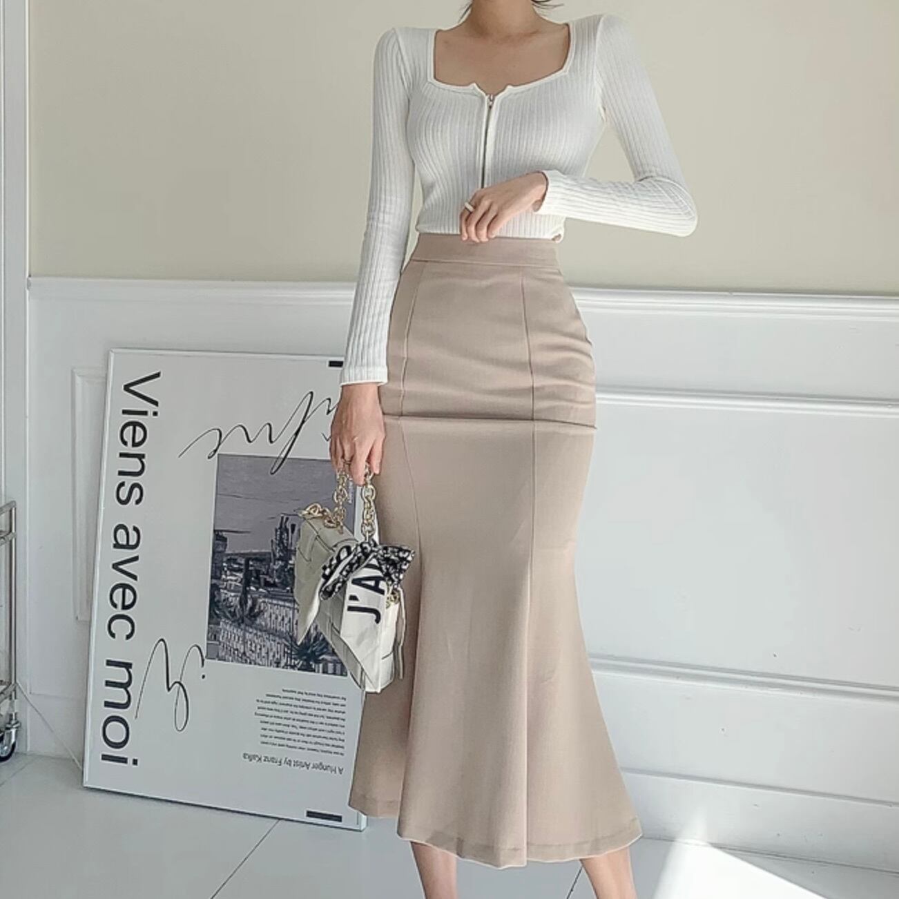 シンプルでスマートな印象のトップスとマーメイドスカートのセットアップ。