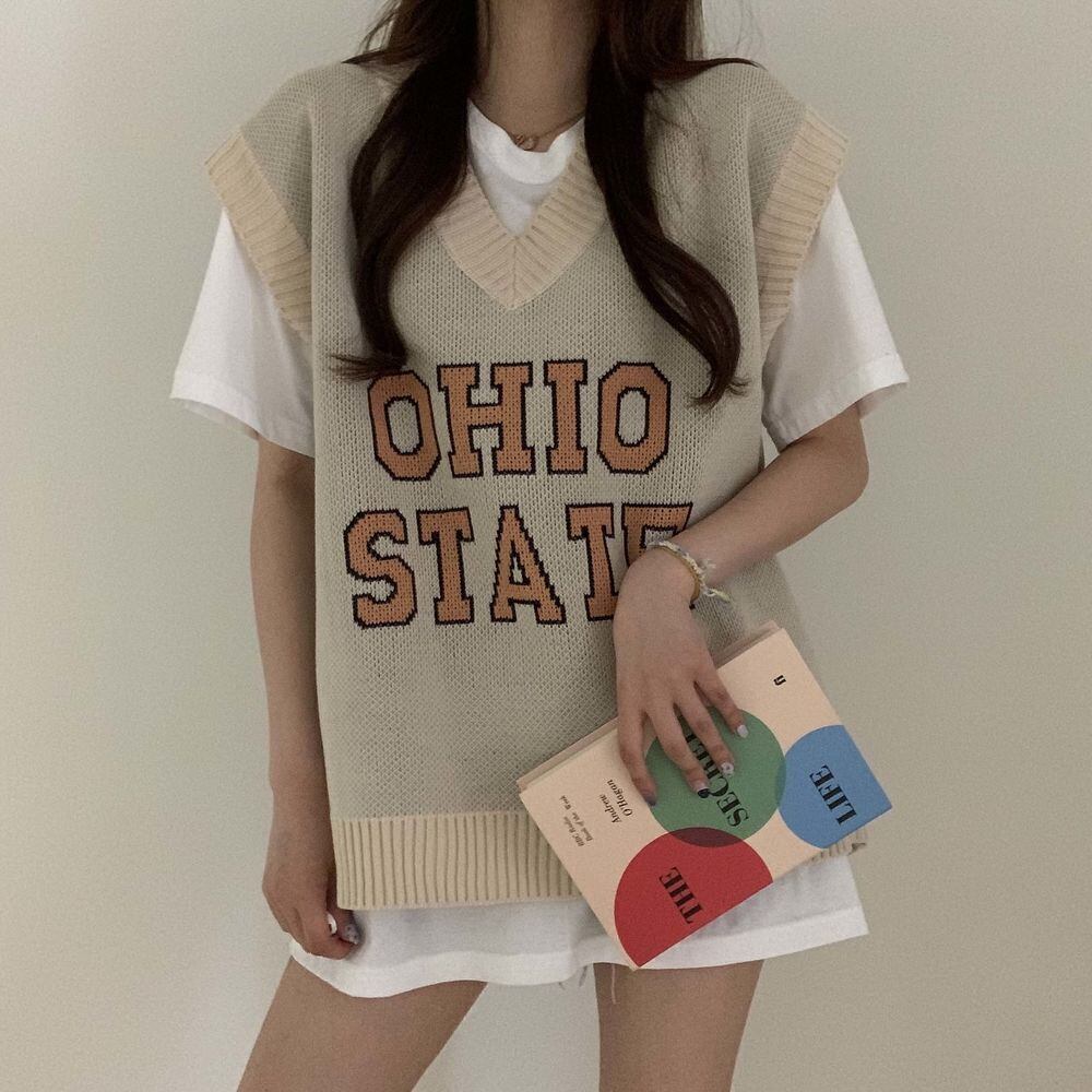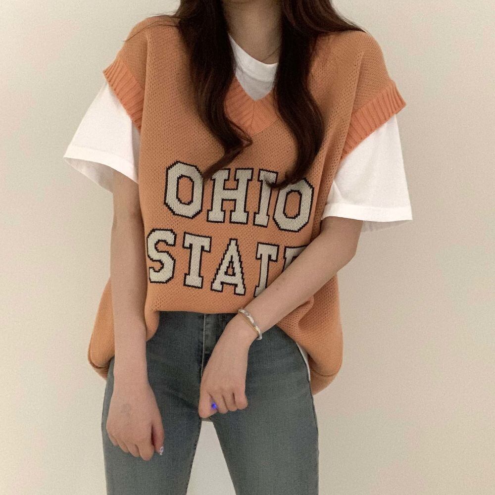 カレッジ風の英字ロゴがかわいい、メンズライクなニットベストです☆