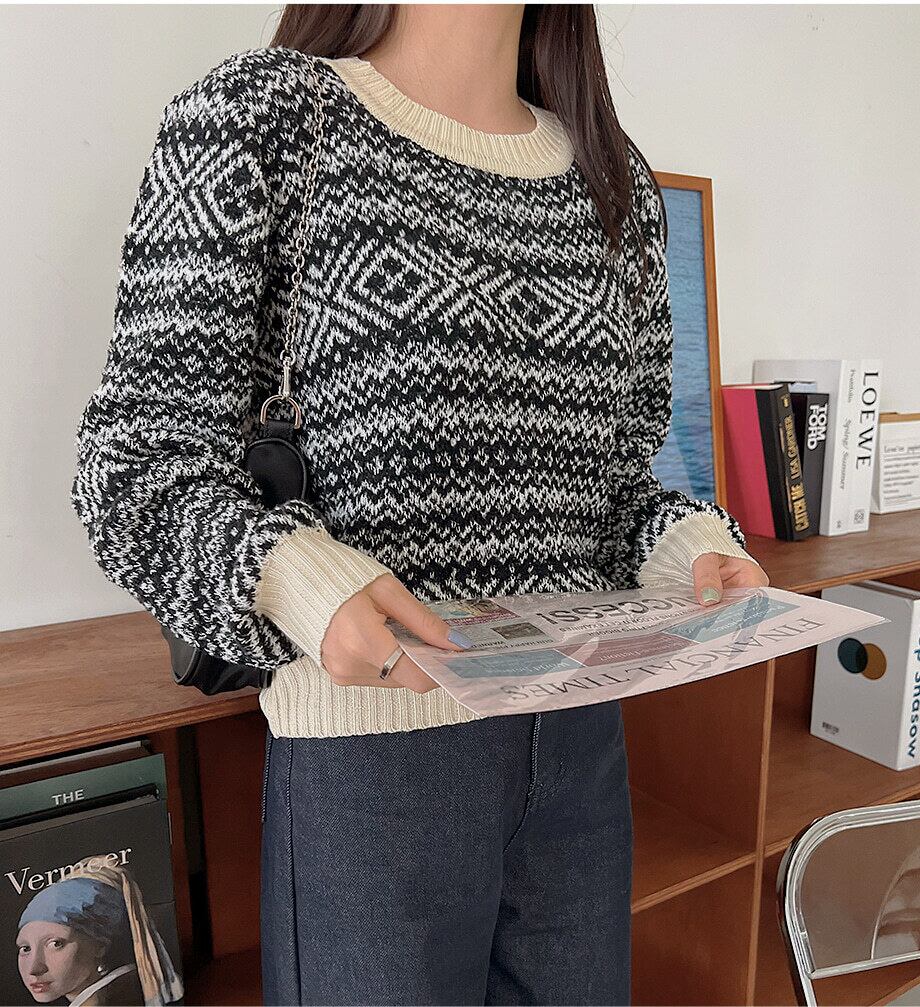 ラウンドネックとリブ編みがお顔周りをすっきりと見せ、ダイヤ柄の編み込みがアクセントになっています☆