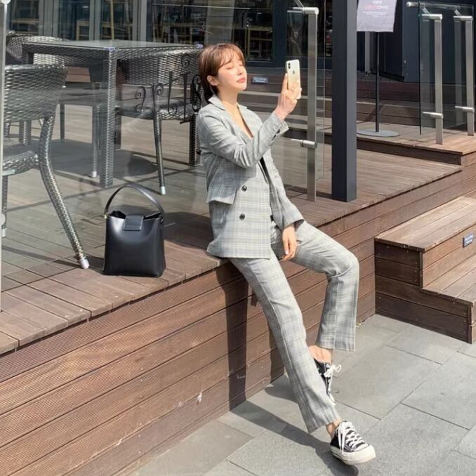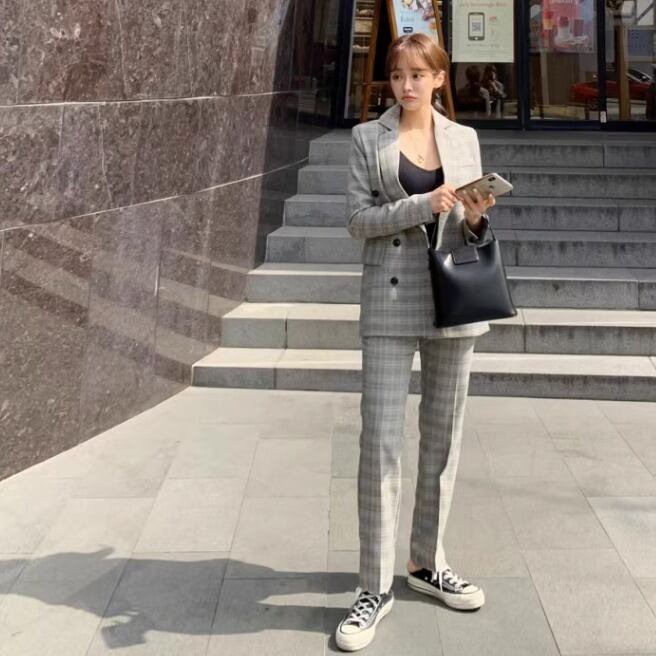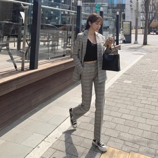 ツーピース ジャケット パンツ スーツ セットアップ スーツジャケット ストレートパンツ ロングパンツ ロング フルレングス 長袖 襟付き ストレート ポケット 2way コンサバ カジュアル おしゃれ かっこいい レトロ こなれ感 ラフ メンズライク マニッシュ 存在感 フォーマル かっちり 都会的 ラグジュアリー プレッピー ジェンダーレス チェック 春 秋 会議 ユニセックス オフィス ビジネス OL 通勤 パーティー レストラン ホテル 婚活 普段使い 着回し トレンド 高見え ゆとり感 グレー