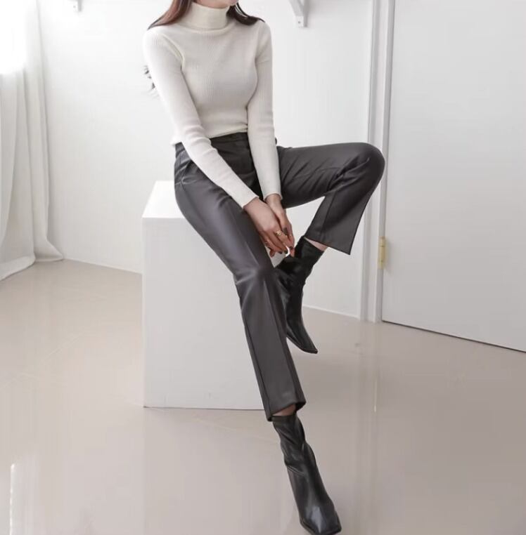 クールでスタイリッシュな印象のレザーパンツ。センタープレス入りのストレートパンツは脚のラインを美しく引き立て、きちんと感を演出してくれます。絶妙な丈がこなれ感を引き出し、裏起毛が施されているため、保温性に優れ、寒い季節にも快適に着用できます。カジュアルなスタイリングにも合わせやすく、おしゃれでかっこいい印象を与えます。