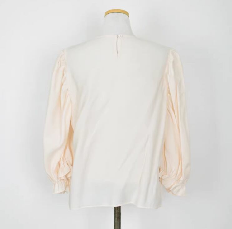 ボリュームのある袖と、フェミニンなフリルデザインがポイント。