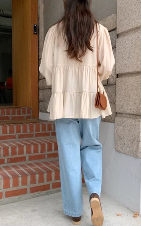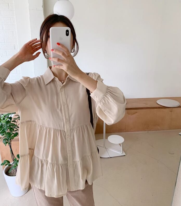 レディース トップス シャツ ブラウス 長袖 ボリューム袖 パフスリーブ 襟付き 角襟 裾ワイド ティアード フェミニン 前開き ボタン かわいい 大人可愛い きれいめ シンプル 上品 おしゃれ レトロ こなれ感 ラフ ルーズ モダン とろみ感 抜け感 ラブリー キュート ラグジュアリー クラシカル 無地 春 秋 オフィス ビジネス OL 通勤 学生 学校 通学 デート お出かけ 公園 女子会 休日 ガーデン ショッピング 重ね着 体型カバー 普段使い 着回し 清楚 ゆったり ゆる フリーサイズ ベージュ