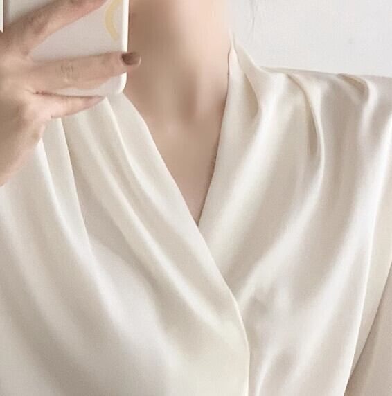 Vネックでデコルテをキレイに見せてくれ、フェイスラインもすっきり。