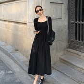 レディース ワンピース 膝下 ロング 丈長 長袖 デコルテ見せ かわいい 大人可愛い きれいめ シンプル カジュアル 上品 おしゃれ かっこいい こなれ感 ラフ マニッシュ クール エレガント モダン とろみ感 抜け感 ナチュラル カジュアルコーデ 無地 秋 冬 ママ デート お出かけ お泊まり 旅行 レストラン 公園 女子会 休日 ホテル ショッピング 海外旅行 重ね着 コーデ 楽ちん プレゼント 体型カバー 美脚 脚長 普段使い 着回し モテ トレンド 流行 インスタ映え 黒 ブラック 茶色 ブラウン