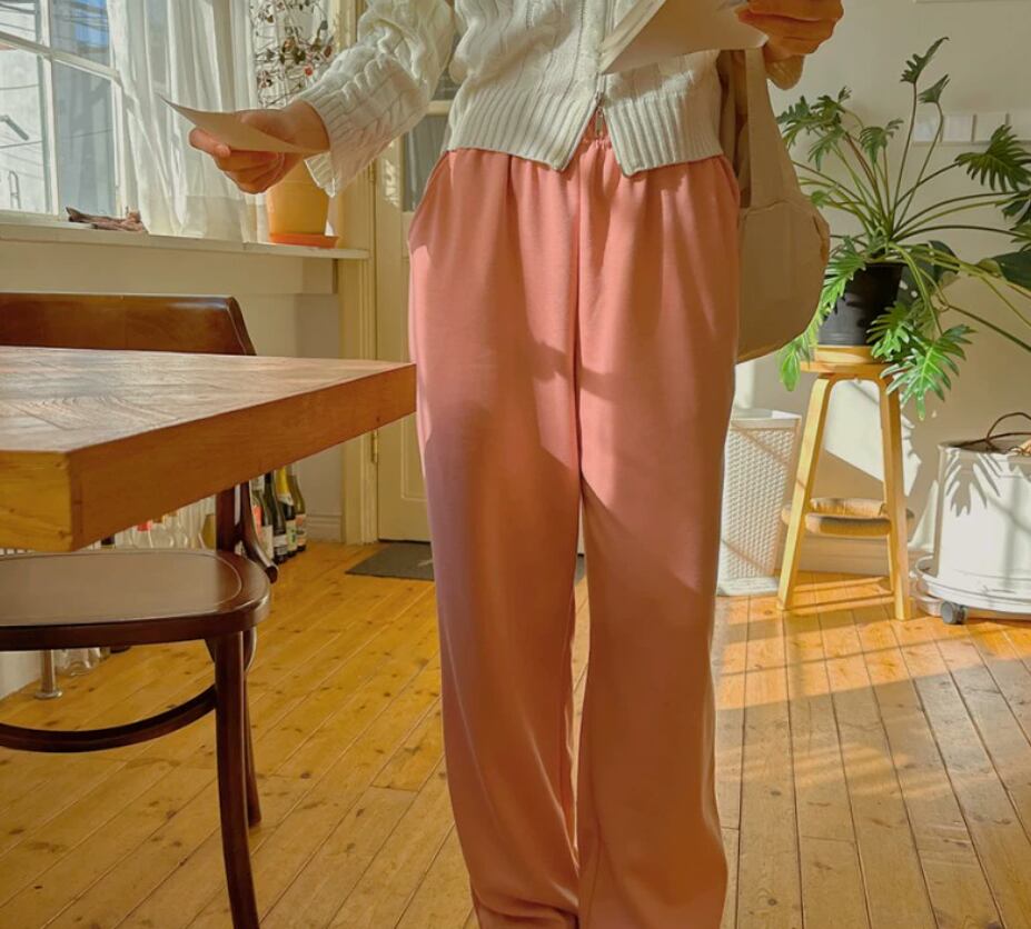 ウエストゴムで楽ちんなのに、ハイウエストで脚長効果も◎。ストレートで落ち感のあるシルエットが、大人可愛い雰囲気を演出。