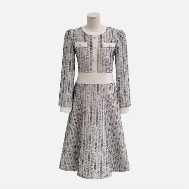 レディース ワンピース 膝下 ミモレ 長袖 Uネック セミフレア ウエストマーク コンサバ ボタン 中厚手 かわいい 大人可愛い きれいめ 上品 おしゃれ かっこいい エキゾチック クール エレガント モダン 主役級 存在感 とろみ感 都会的 ラグジュアリー クラシカル ツイード 秋 冬 発表会 クリスマス バレンタイン ママ デート お出かけ お泊まり パーティー イベント レストラン 女子会 休日 ホテル 合コン コンパ コーデ 暖かい 体型カバー 美脚 脚長 普段使い 着回し モテ 清楚 トレンド