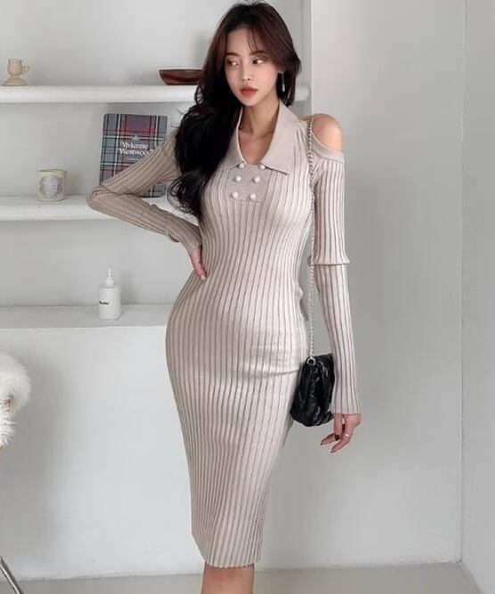 スリムなシルエットに肩だしのデザインがセクシーなワンピースです!