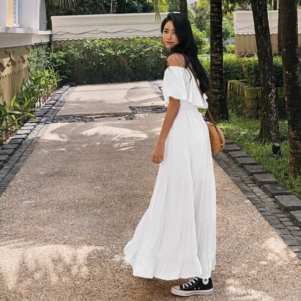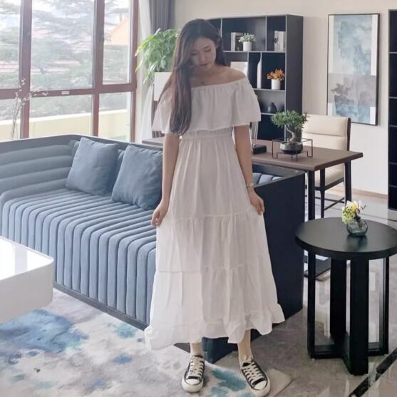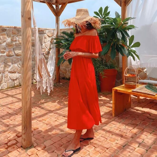 たっぷりのフレアなショルダーデザインが可愛らしさをアピールしてくれるワンピース。アジアンリゾートを彷彿させるデザインだから、休日やリゾートでの特別な時間を演出します。シンプルでありながらも、フリルやステッチギャザーのディテール、Aラインのシルエットが女性らしさを引き立ててくれます。