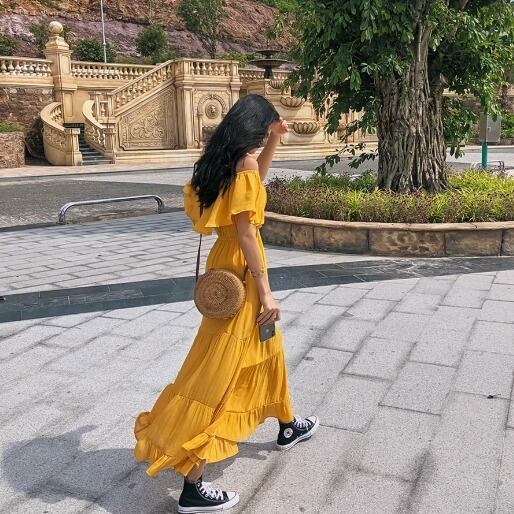レディース ワンピース ロング 8分丈 クロップド丈 半袖 フレアスリーブ フリル袖 オフショルダー 襟なし ノーカラー フレア Aライン ギャザー フリル 透け感 異国風 ギャザー 薄手 柔らか 大人可愛い きれいめ シンプル カジュアル 上品 おしゃれ レトロ アジアン こなれ感 ラフ ガーリー ルーズ 個性的 存在感 抜け感 キュート ラグジュアリー 休日感 フェミニン 無地 夏 アウトドア リゾート 旅行 海 プール ビーチ 休日 バカンス ショッピング フェス 楽ちん 体型カバー イエロー