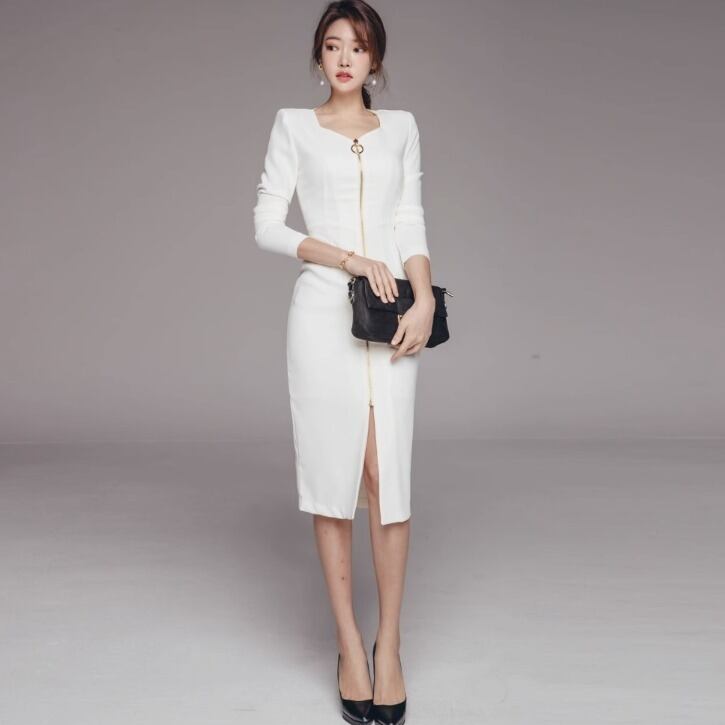 レディース ワンピース 膝下 長袖 ペンタゴンネック タイト スリム Iライン ファスナー 前開き フルオープン きれいめ シンプル カジュアル 上品 おしゃれ かっこいい レトロ こなれ感 個性的 エレガント 抜け感 都会的 ラグジュアリー クラシカル 休日感 ハイエンド 無地 春 秋 オフィス ビジネス OL デート お出かけ パーティー レストラン 休日 ホテル ショッピング 合コン Bar お呼ばれ クラブ 韓国 普段使い モテ ホワイト ブラック ベーシックカラー 大人カラー モノトーン