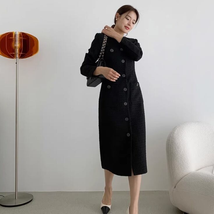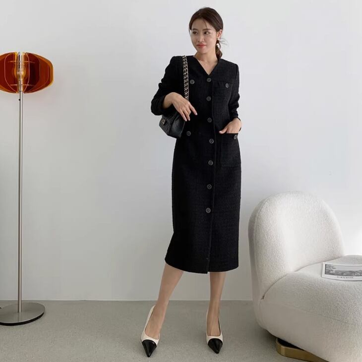 レディース ワンピース ミモレ 長袖 Vネック 襟なし ノーカラー スリム Iライン ポケット 前開き コンサバ ボタン フルオープン ツイード きれいめ シンプル カジュアル 上品 おしゃれ かっこいい レトロ こなれ感 マニッシュ エレガント フォーマル かっちり 都会的 ラグジュアリー ハイエンド ドレッシー 無地 秋 冬 オフィス ビジネス OL 通勤 デート お出かけ パーティー レストラン 休日 ホテル ショッピング 婚活 Bar 韓国 普段使い 着回し 清楚 トレンド ブラック ベージュ