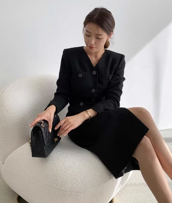 ツイード素材が高級感と上品さを演出し、シンプルでありながらも洗練されたデザイン。スリムなIラインのシルエットが女性らしい魅力を引き立て、ミモレ丈が品のある印象を与え、大人の女性にふさわしい上品さを演出します。Vネックが華奢な首元を際立たせ、ファッショナブルでありながらも品のある印象を与えてくれるフォーマルなワンピースです。