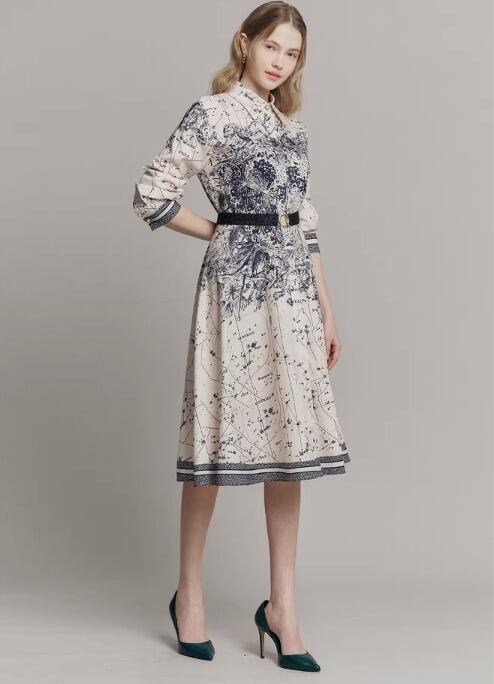 ヴィンテージでナチュラルなプリントが印象的なシャツワンピース。Aラインシルエットが女性らしい魅力を引き立て、フレアの広がりが優雅な印象に。ベルトでウエストを引き締めることでシルエットをより美しく見せます。大人可愛い雰囲気を演出しながらも、きれいめで上品なスタイリングにもマッチします。