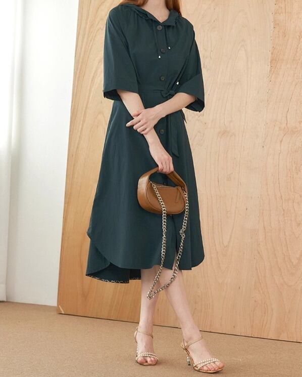 フィッシュテールのような後ろ丈が長めにデザインされているシャツワンピースは、フード付きで個性感溢れる1枚。7分袖のデザインが季節の変わり目に大活躍。リラックス感とスタイリッシュさを兼ね備えた魅力的な一着です。りぼんベルトでウエストをマークし、メリハリのあるスタイリングに。