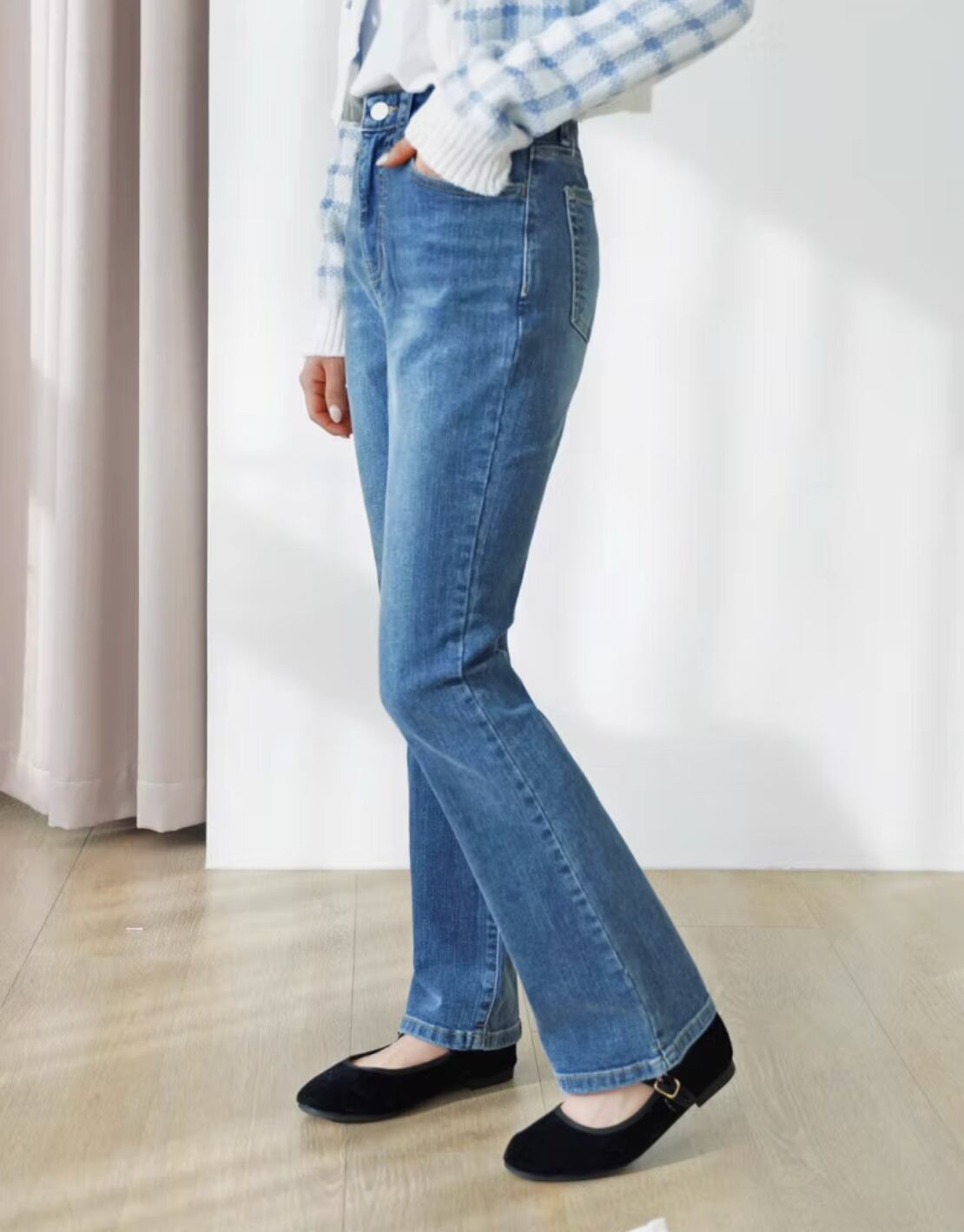 カジュアルにもキレイめにも使えるブーツカットデニム。膝下からゆったりと広がるシルエットが、脚をキレイに見せてくれます。シンプルで上品なブルーがキレイ目コーデにもピッタリで、様々なシーンで使える万能デニムです◎