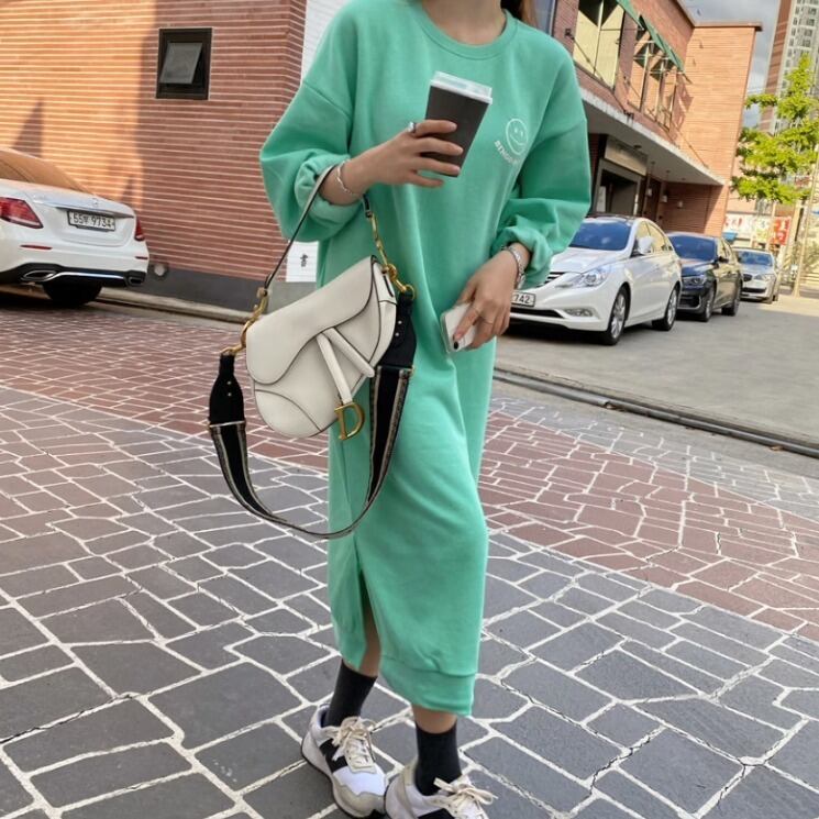 レディース プルオーバー スウェット スウェットワンピース ロング 長袖 ラウンドネック 襟なし ノーカラー ストレート Iライン オーバーサイズ スリット 裏起毛 かわいい シンプル カジュアル おしゃれ レトロ こなれ感 ラフ スポーティー ルーズ 個性的 存在感 抜け感 アクティブ 休日感 ストリート お茶目 プリント ニコちゃん 秋 冬 お出かけ アウトドア 休日 カフェ 散歩 楽ちん 暖かい 体型カバー 普段使い 着回し レイヤード トレンド ゆったり フリーサイズ ライトグレー グリーン