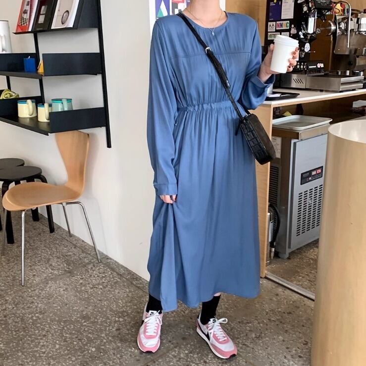 レディース ワンピース ロング 9分丈 長袖 カフスボタン ラウンドネック 襟なし ノーカラー ワイド ストレート Iライン オーバーサイズ リボン ベルト ウエストマーク ウエストリボン 薄手 柔らか シンプル カジュアル レトロ こなれ感 ラフ ルーズ 抜け感 カレッジ風 学生風 ベーシック アクティブ 休日感 活発 無地 春 秋 学生 お出かけ 公園 休日 ショッピング カフェ 図書館 散歩 楽ちん 体型カバー 普段使い 着回し 清楚 トレンド 定番 ゆったり フリーサイズ ワンサイズ ブルー