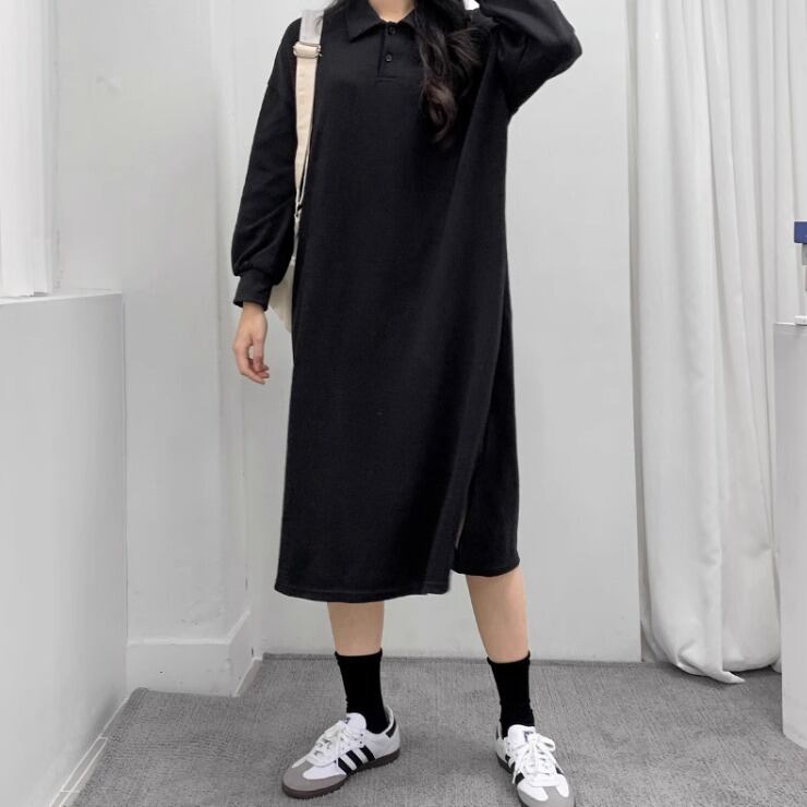レディース ワンピース スウェットワンピース ミモレ ロング 襟付き ポロカラー ワイド ストレート Iライン オーバーサイズ ボタン スウェット 柔らか シンプル カジュアル おしゃれ レトロ こなれ感 ラフ ボーイッシュ ルーズ 個性的 抜け感 カレッジ風 学生風 ナチュラル 休日感 ストリート 控えめ 無地 春 秋 学生 お出かけ アウトドア イベント 休日 ショッピング フェス 図書館 散歩 楽ちん 体型カバー 普段使い 着回し トレンド 定番 ゆったり フリーサイズ ブラック グレー ブルー