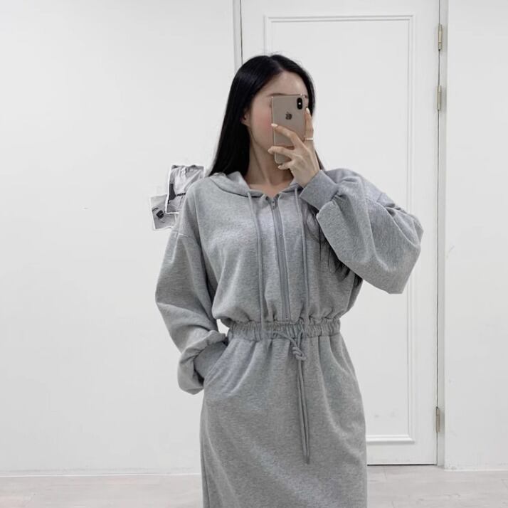 レディース ワンピース スウェット スウェットワンピース ミモレ ロング 長袖 襟なし フード Iライン オーバーサイズ ウエストマーク ファスナー ポケット ウエストゴム ドロスト 絞り 中厚手 柔らか 大人可愛い シンプル カジュアル おしゃれ レトロ こなれ感 ラフ ルーズ 個性的 存在感 カレッジ風 学生風 アクティブ 休日感 ユニーク 無地 秋 冬 お出かけ アウトドア 女子会 休日 ショッピング カフェ 散歩 韓国 楽ちん 体型カバー 普段使い 着回し トレンド ゆとり感 グレー 大人カラー