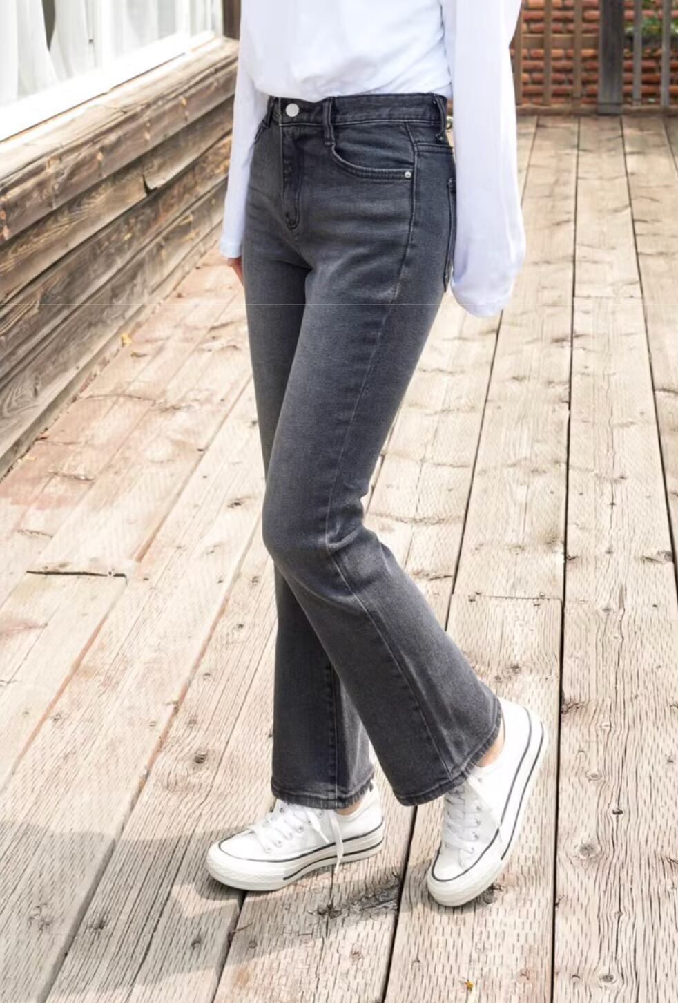 キレイめカジュアルコーデにピッタリのブーツカットデニム。落ち着いた色味が、カジュアルすぎず上品にランクアップしてくれます。裾に向かってゆったり広がるシルエットが体型の悩みをカバーしてくれ、美脚効果抜群です。