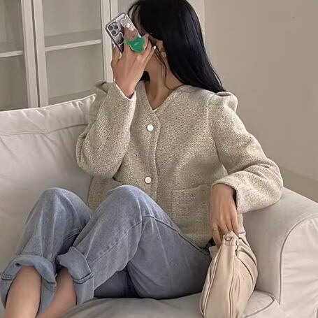 ノーカラーデザインがおしゃれなツイードジャケット。